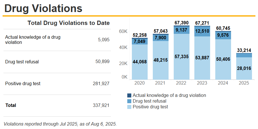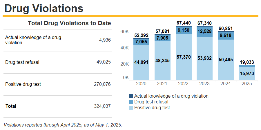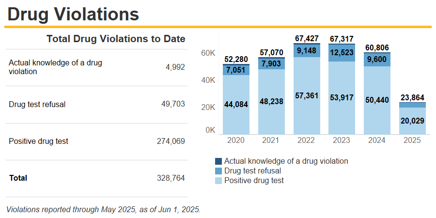 Since January 6, 2020, there were 337,921 test results reported to the Clearinghouse with drug-related violations. The graph breaks out the results by violation type, for controlled substance (drug) tests.