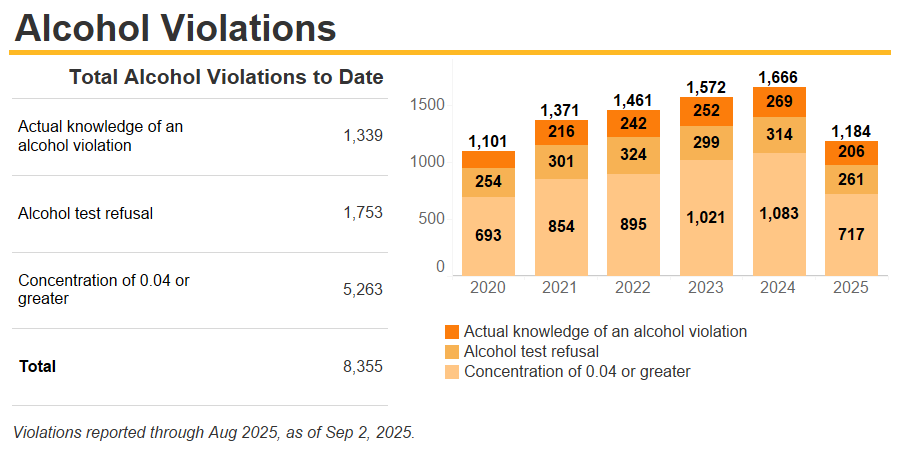 Since January 6, 2020, there were 8,355 test results reported to the Clearinghouse with alcohol-related violations. The graph breaks out the results by violation type, for alcohol tests.