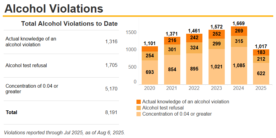 Since January 6, 2020, there were 8,191 test results reported to the Clearinghouse with alcohol-related violations. The graph breaks out the results by violation type, for alcohol tests.