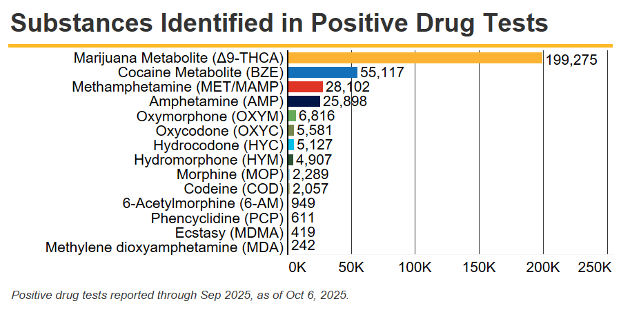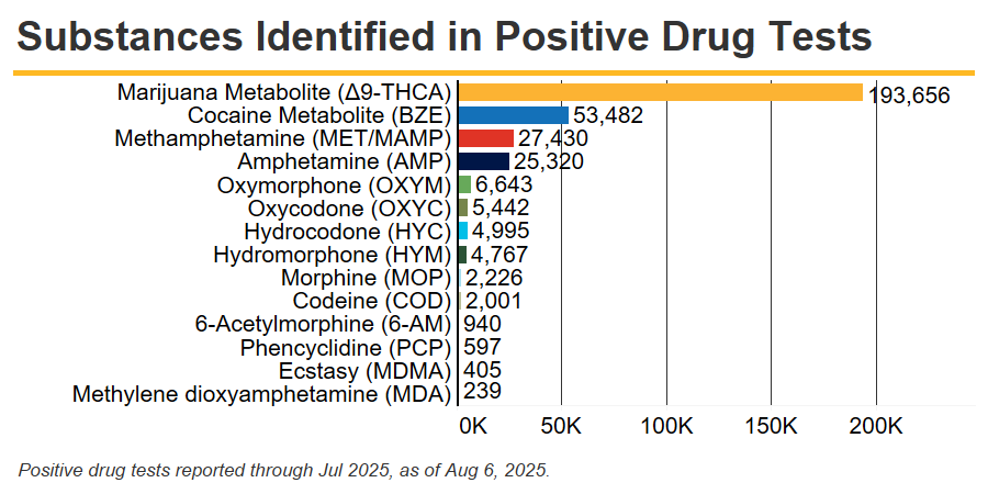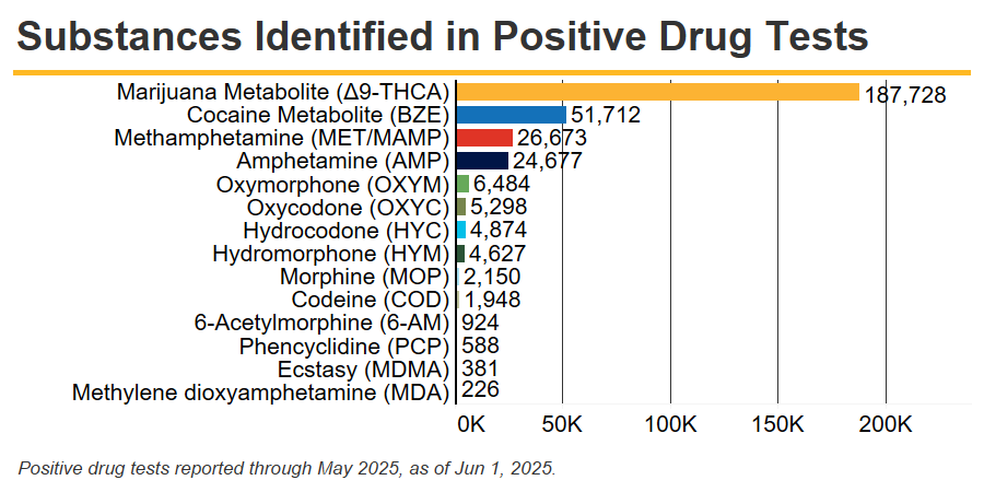 Positive drug tests account for 82% of the total violations reported. The graph shows total results reported to the Clearinghouse since January 6, 2020 of the number of times a driver tested positive for each substance.