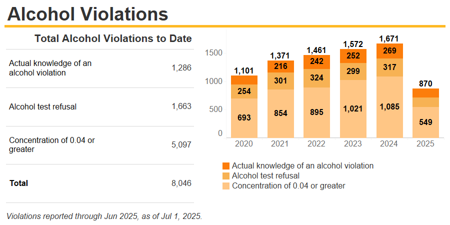 Since January 6, 2020, there were 8,046 test results reported to the Clearinghouse with alcohol-related violations. The graph breaks out the results by violation type, for alcohol tests.
