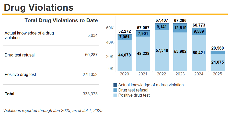 Since January 6, 2020, there were 333,373 test results reported to the Clearinghouse with drug-related violations. The graph breaks out the results by violation type, for controlled substance (drug) tests.