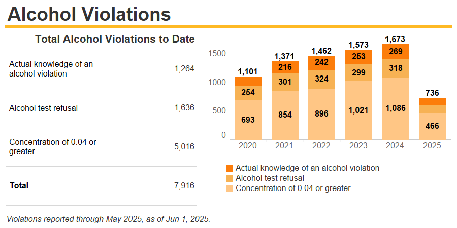 Since January 6, 2020, there were 7,916 test results reported to the Clearinghouse with alcohol-related violations. The graph breaks out the results by violation type, for alcohol tests.