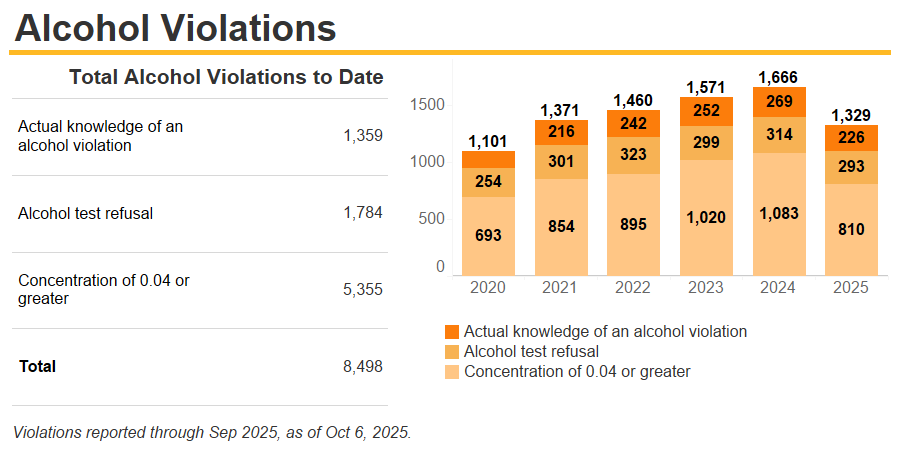 Since January 6, 2020, there were 8,498 test results reported to the Clearinghouse with alcohol-related violations. The graph breaks out the results by violation type, for alcohol tests.